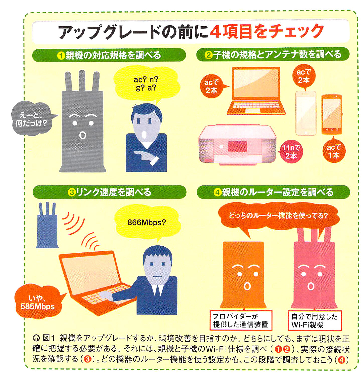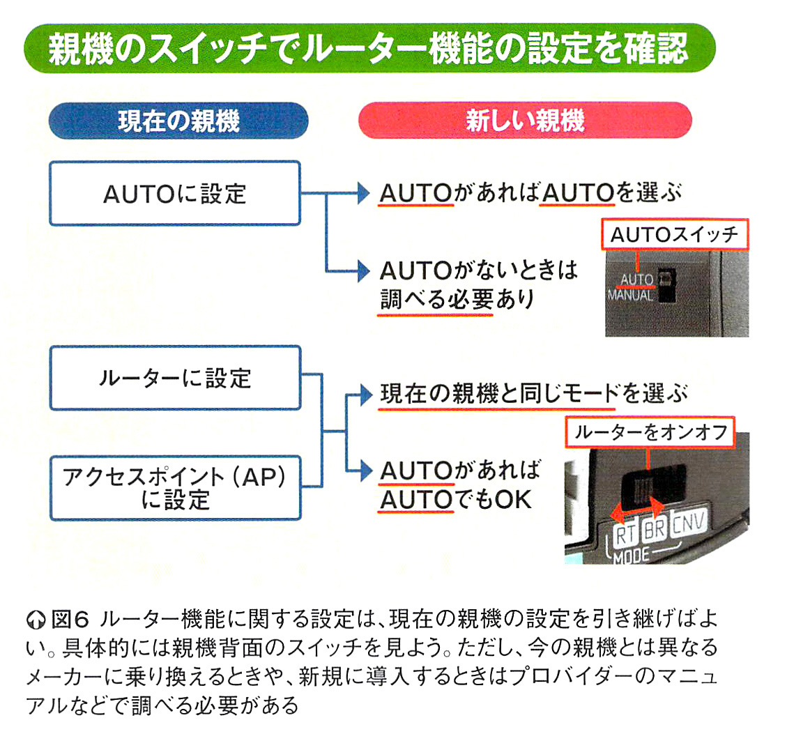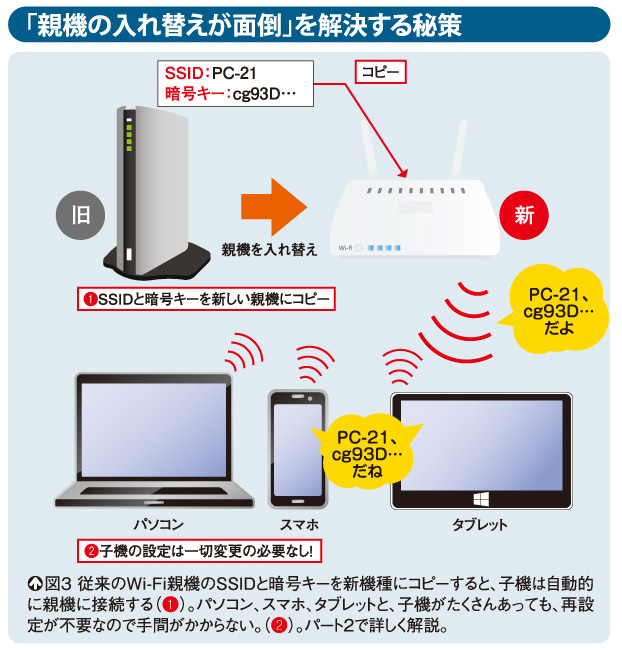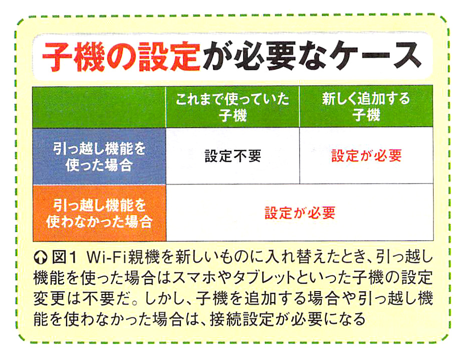 ここからは、実際にWi-Fi親機を交換する方法を見ていこう。ポイントとなるのは「引っ越し機能」だ。これは、前の親機のSSIDと暗号キーを新しい親機にコピーする機能のこと。これを使うことで、親機の入れ替え時に生じる設定変更の手間を大幅に低減できる(図1)。