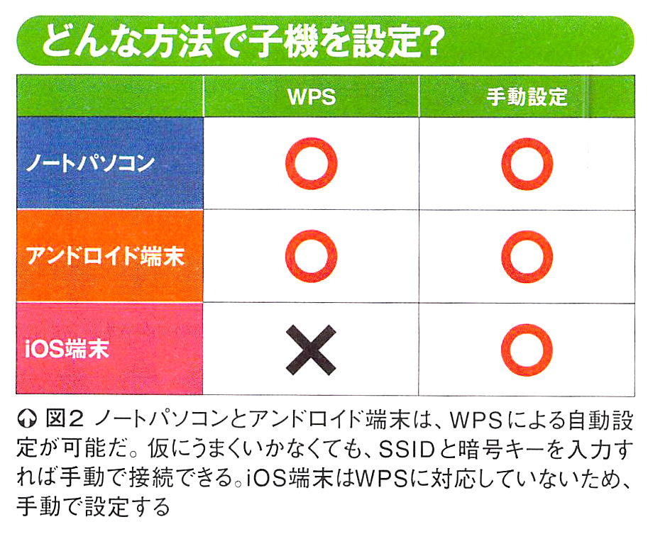 ただし、引っ越し機能を利用するには、これまで使っていた親機が「WPS(ダブリュピーエス)」と呼ばれる自動設定機能を備え、新しい親機にはこの引っ越し機能が搭載されていることが条件だ(図2)。WPSは10年以内に購入した親機なら標準装備されているため、実質的には新しい親機が引っ越し機能を備えていればよい[注]。図3に、引っ越し機能を持つ主な機種をまとめた。
