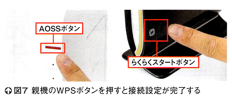 次に、前の親機のWPSボタンを押して設定を送信する(図6)。新しい親機が設定を受信すると、前面のランプが図7の①の状態になる。しばらくすると、前の親機もバッファロー製であれば③の状態に、そうでなければ②の状態になる。②になったときは2・4GHz帯の設定しかコピーされていないが、もう一度WPSボタンを押すと5GHz帯の設定もコピーされる。③の状態になったら、AOSSボタンを2秒問押し続ければ設定コピーは完了だ。