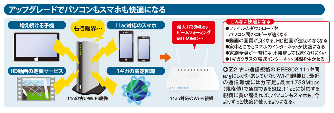何もせずに親機を入れ替えた場合は、接続する子機であるパソコンやスマホ、タブレットなどの接続設定をすべてやり直す必要がある。最近は家族の人数分だけスマホがある家庭が多く、パソコンに加えてプリンターやゲーム機などもWi-Fiでつながっているため、相当な手間がかかる。