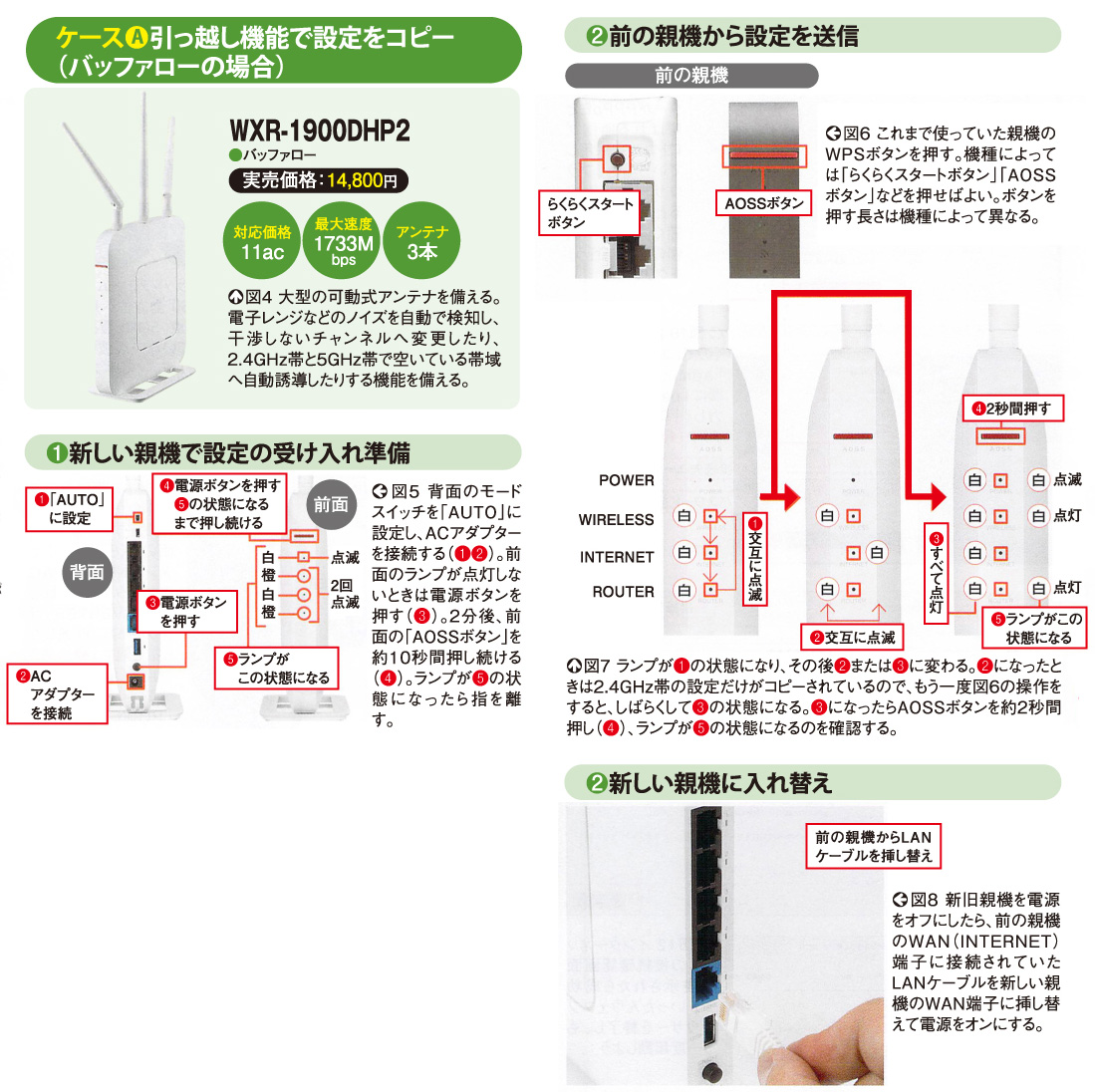 まずは、バッファローの製品について説明しよう(図4)。最初は新しい親機での受け入れ準備だ。背面のモードスイッチを「AUTO」に設定し、ACアダプターを接続し電源を入れる(図5左)。次に、前面の「AOSSボタン」を長押しすると、前面のランプが図5の⑤の状態になる。これで準備は完了だ。