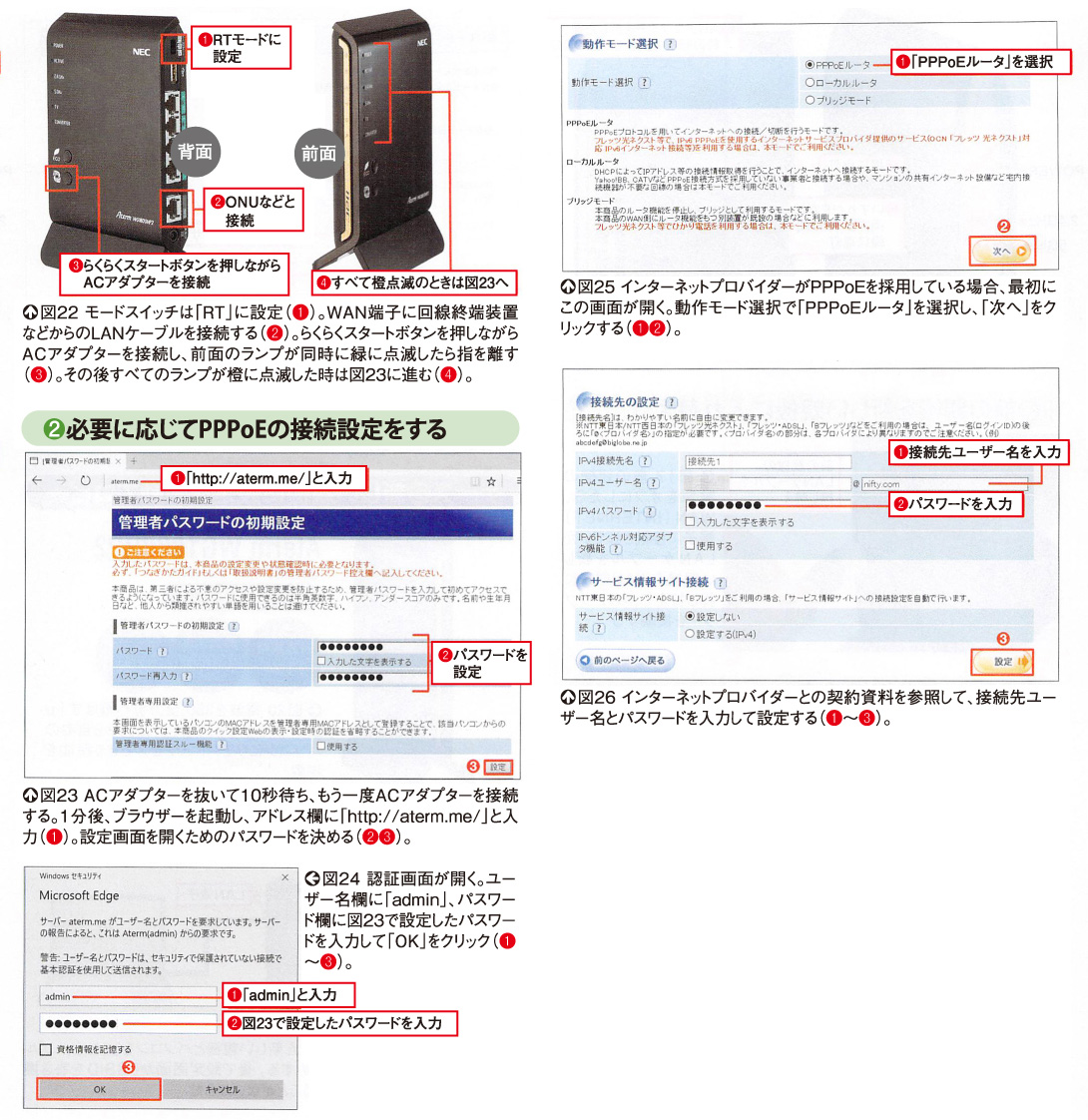 背面のモードスイッチは、RTモードに設定する。らくらくスタートボタンACアダプターを接続し、前面のランプがすべたみどりに 点滅したら指を離す。これで、親機として使える準備ができた(図22)。ただし、プロバイダーのPPPoEの場合、その後ですべてのランプが橙に点滅する。その場合、プロバイダーへの接続が必要だ(図23~図26)。