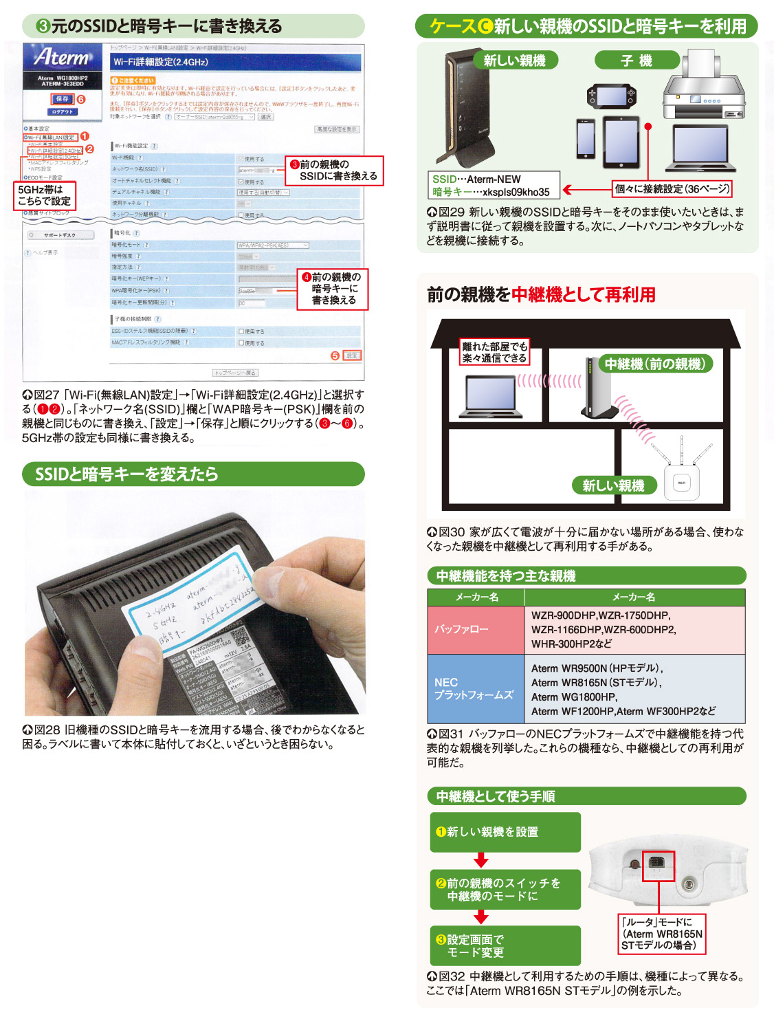 ただし、すべての親機が中継機になるわけではない。主要メーカーではおおむね2012年以降に発売された機種が中継機能を備えている。ただし、初期の製品は新旧の親機が同じメーカーでないと中継機として使えないものもある。手元の機種の機能を調べてみよう(図31)。設定方法は機種によって異なる。図32では、NECプラットフオームズの占い機種の概略手順を示した。